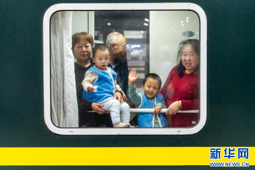 两位小乘客正通过车窗向镜头打招呼。新华网 耿骏宇 摄
