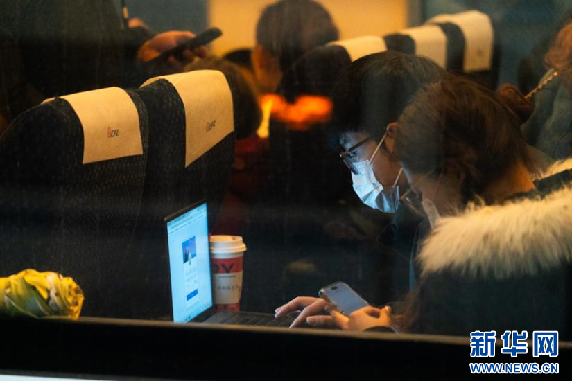 一名乘客正在车厢里使用笔记本电脑。新华网 耿骏宇 摄