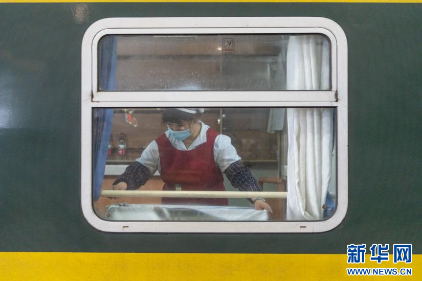 发车前一名乘务员正在整理车厢。新华网 耿骏宇 摄