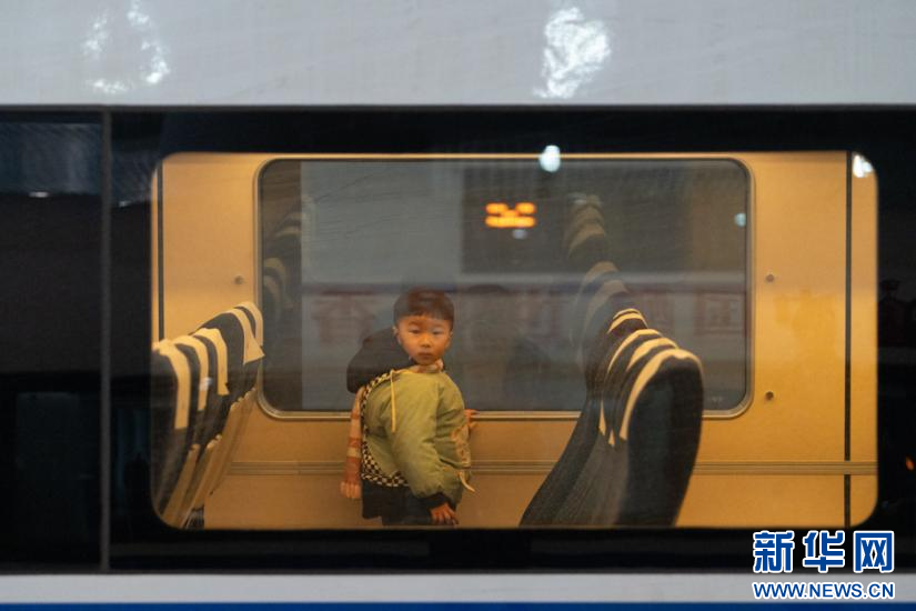 等待发车,一名小旅客正从车厢里向外张望。新华网 耿骏宇 摄