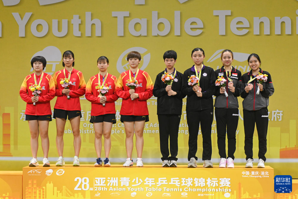 ↑冠军中国组合张翔宇(左四)/纵歌曼(左三)、亚军中国组合覃予萱(左一)/王晓楠(左二)、季军中国台北组合陈琦媗(右三)/郑朴璿(右四)和新加坡组合舒麟茜(右二)/陈昭澐在女子双打颁奖仪式上。新华社记者 张子彧 摄