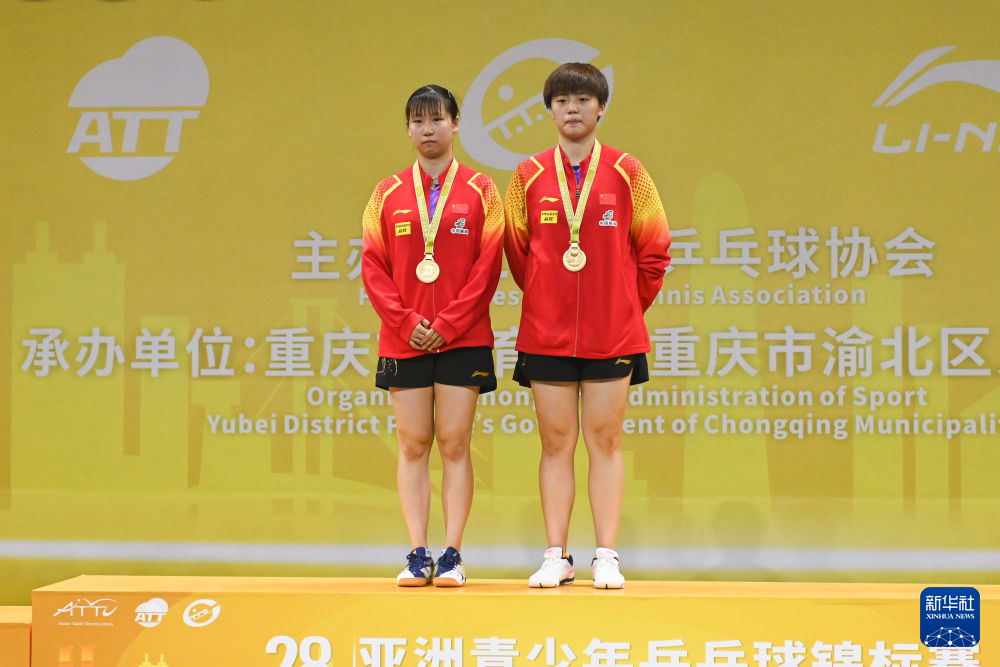 ↑冠军中国组合张翔宇/纵歌曼(左)在女子双打颁奖仪式上。新华社记者 张子彧 摄