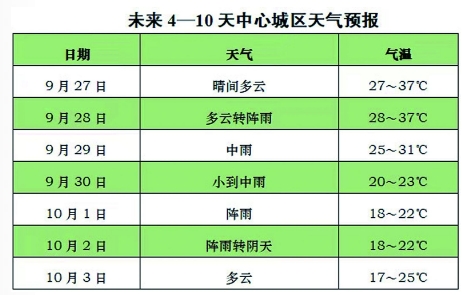 9月25日夜间到26日白天:各地多云到晴,局地有阵雨,气温18~36oC;中心城区多云,气温 26~33oC。