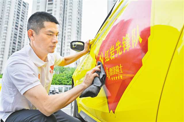 4月25日清晨,山城裹着一层薄雾,重庆市出租汽车有限责任公司停车场内,殷其龙正用抹布细细擦拭挡风玻璃上的水痕。阳光照在引擎盖上,“重庆雷锋的士”六个红字格外醒目,一旁的五颗红星也被他擦得锃亮。