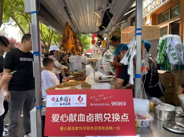 “五一”假期第一天,重庆市血液中心将献血活动带至荣昌区夏布小镇和安陶小镇,创新推出“献血赠卤鹅券”公益活动。市民游客可以参与献血奉献爱心,领取特色卤鹅兑换券,让“热血”与“美味”共同传递城市温度。