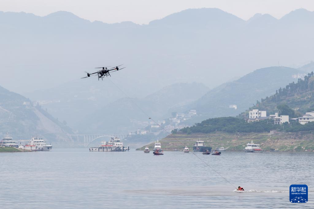 5月15日,在重庆市奉节县开展的三峡库区地方航道危岩地灾应急实战演练现场,救援无人机在营救模拟落水人员。