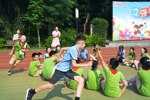 中英学生一起玩耍“丢手绢”游戏。