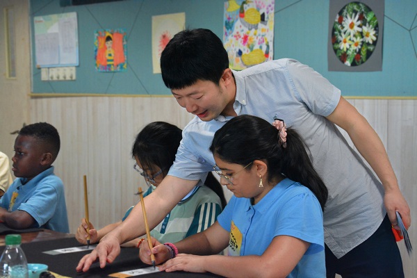 在五楼美术活动室,教师杨伟林带领英国师生走进书法世界。从“象形文字”的起源讲起,英国学生手执毛笔,在纸上临摹“朋友”汉字。尽管笔法稚嫩,但专注的神情与跃动的墨痕,勾勒出对中华文字的好奇与喜爱。一名英国学生举着自己书写的“朋友”字兴奋表示:“这是我第一次用毛笔,太神奇了!”