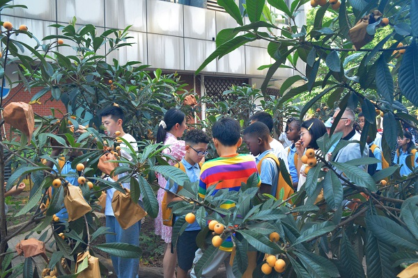 英国师生首先走进校园农场,在康恒师生引导下参观枇杷、四季豆、向日葵等种植区,亲手采摘果实并品尝,直观感受学校“劳动教育”实践成果。随后在“阳光大课间”活动中,康恒学子以整齐的韵律操、武术操展现校园活力,英国学生热情加入“丢手绢”等传统游戏,与中国伙伴互动协作,操场上笑声此起彼伏。