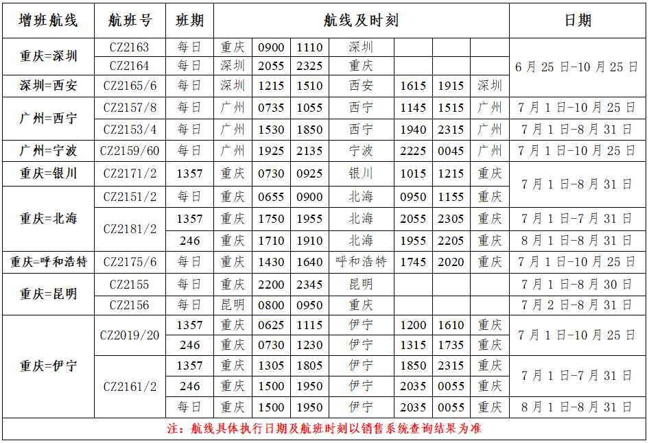 自7月1日起,重庆航空新开重庆=银川航线,每周一三五七执行,去程航班号为CZ2171,07:30从重庆江北国际机场起飞,09:25抵达银川;回程航班号为CZ2172,10:15从银川起飞,12:15落地重庆。同时,重庆航空还将恢复重庆=北海航线至每日最多两班,加密重庆=昆明航线至每日两班。
