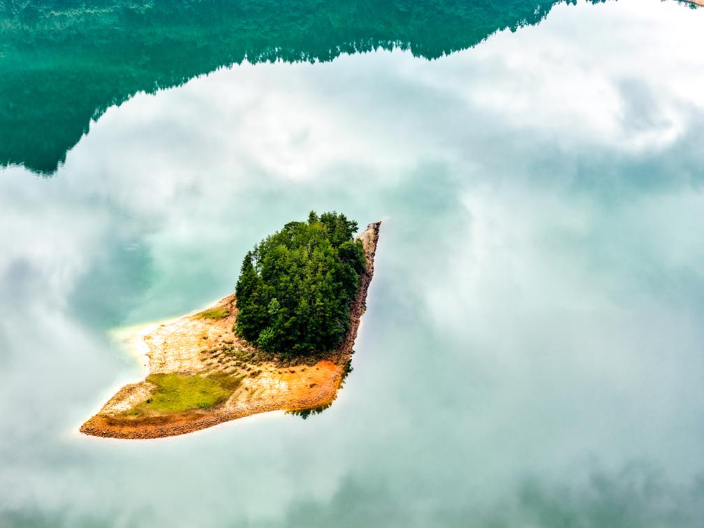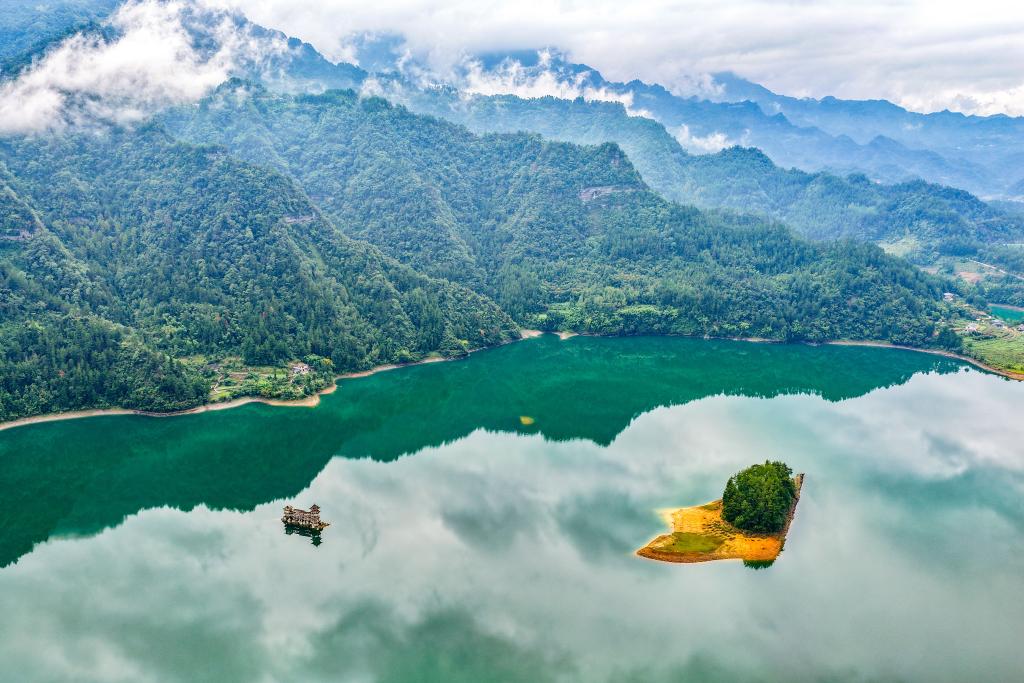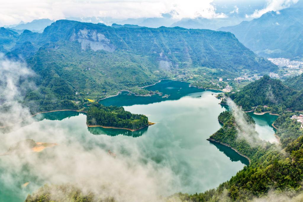 初秋时节,位于重庆市黔江区内的小南海湿地自然保护区湖水碧如翡翠,倒映着远山青黛,云雾朦胧,宛如一幅水墨丹青。