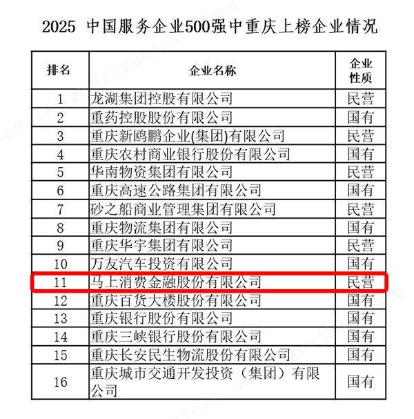 9月18日,中国企业联合会、中国企业家协会在重庆发布“2025中国服务业企业500强”,马上消费连续第七年荣登该榜单。这不仅是对其经营质量与科技实力的高度认可,也是对其积极践行企业社会责任、持续创造综合价值的有力见证。