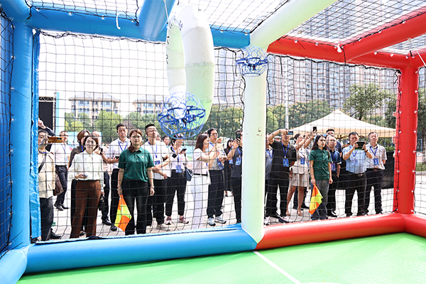 铜梁区外国语实验小学校学生正在展示“无人机足球”。