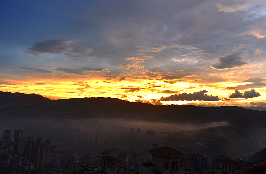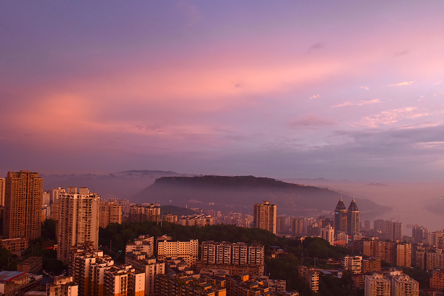 朝霞满天,位于长江边的涪陵城区如梦似幻。城市在这漫天朝霞中渐渐苏醒,开启活力满满的一天。新华网发(黄河 摄)