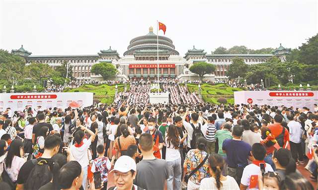 10月1日上午,重庆市在人民广场举行国庆升旗仪式,3000余人在现场观礼,为祖国母亲76岁生日送上祝福。