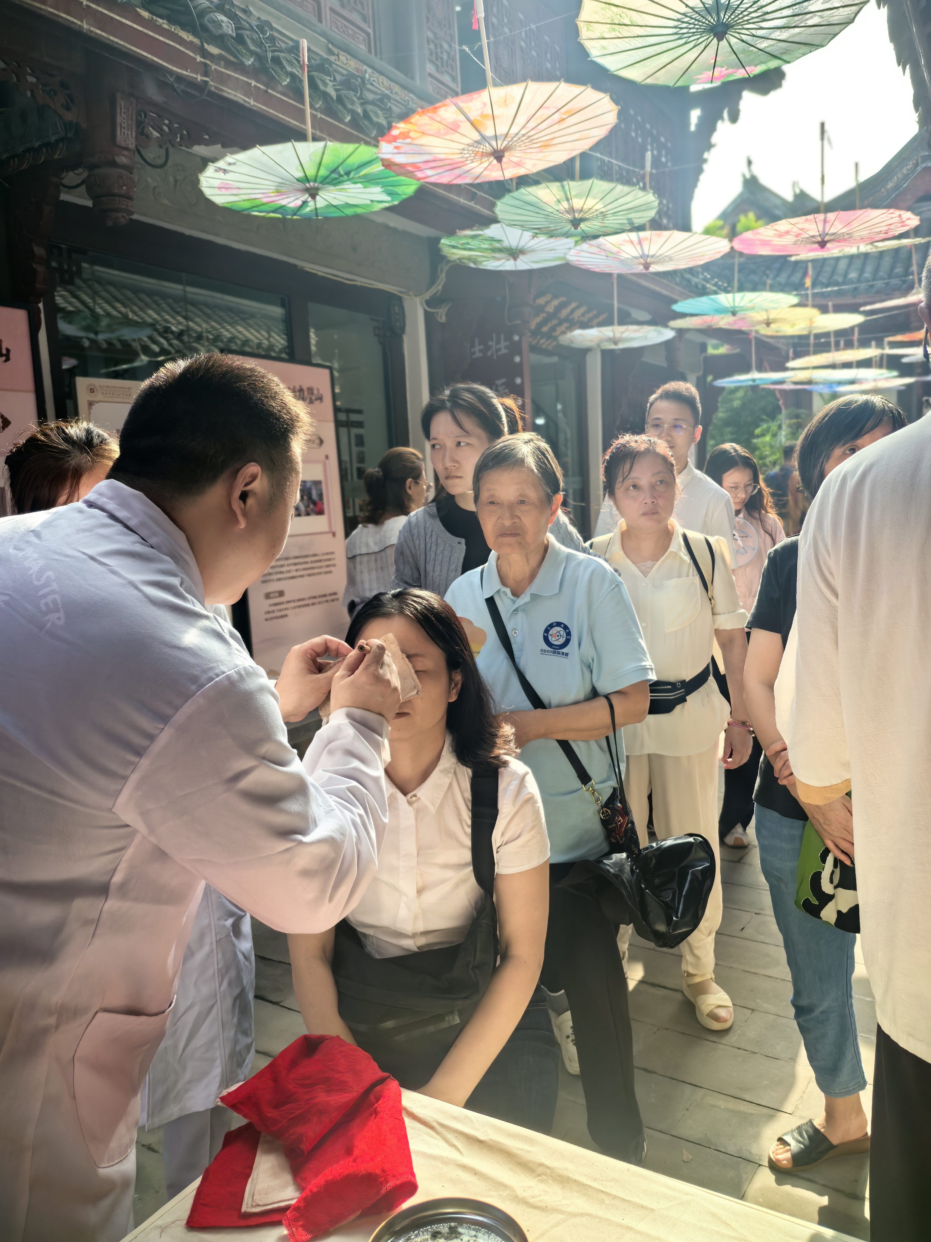 集市中,唐成林重庆市名中医工作室、黄思琴针灸面雕工作室作为“名医阵地”广受关注。唐成林工作室的医师现场展示了针灸与整脊手法,帮助颈椎病患者缓解症状;黄思琴则讲解针灸美容的原理,强调“由内养外”的中医理念,吸引众多市民参与互动。