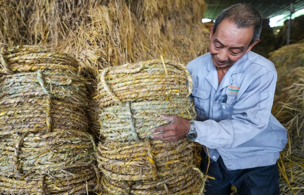 9月12日,垫江县周嘉镇雨山村秸秆统一回收点,工人在整理秸秆半成品。特约摄影 龚长浩