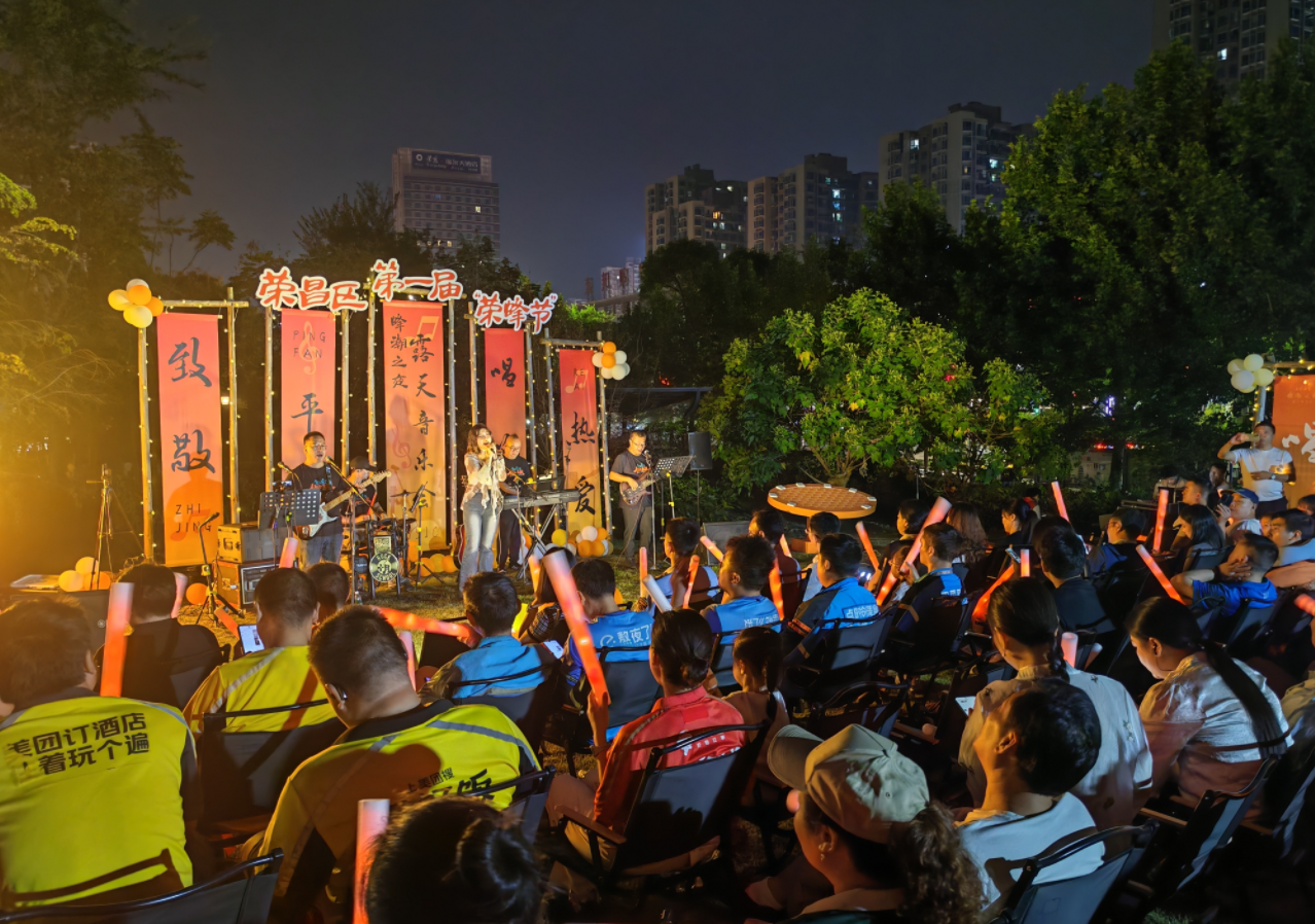 近日,荣昌区2025年第一届“荣蜂节”开幕式暨“蜂潮之夜”露天音乐会举行。活动由荣昌区委社会工作部联合团区委主办,以“致敬平凡、唱响热爱”为主题,通过“乐队表演+素人展示+互动点歌”模式,向外卖小哥、快递员、网约车司机、货车司机、网络主播等新就业群体一线从业者致敬,用旋律传递城市温情与正能量。