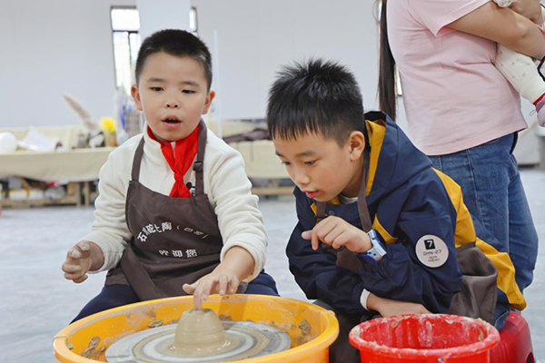 孩子们体验土陶制作。(谭登帆 摄)