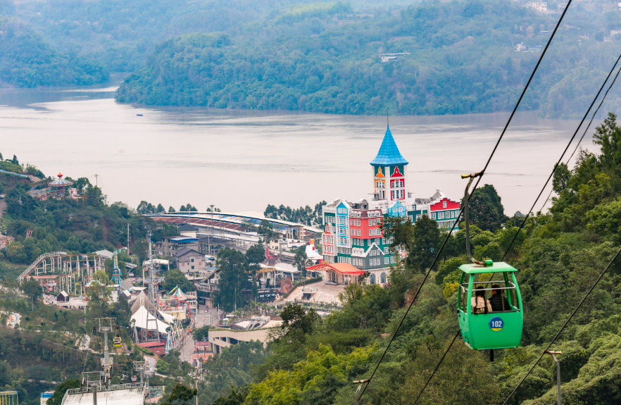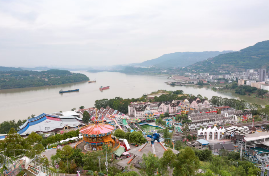 蓄水后的长江宛如一条绸带,将美心红酒小镇景区轻轻环绕。小镇内,尖顶彩墙的欧式建筑群沿江岸错落分布,彩色酒店、古堡民宿在波光中倒影摇曳,仿佛置身童话世界。站在400米长的“中西合璧廊桥”上,中式砖雕门楼与西式拱券窗棂交织,廊桥周边栾树花海如金色云霞,与江面白鹭翩跹构成动静相宜的生态图景。渝怀铁路穿镇而过,列车不时呼啸掠过江面,为这幅山水画卷增添一抹现代动感。