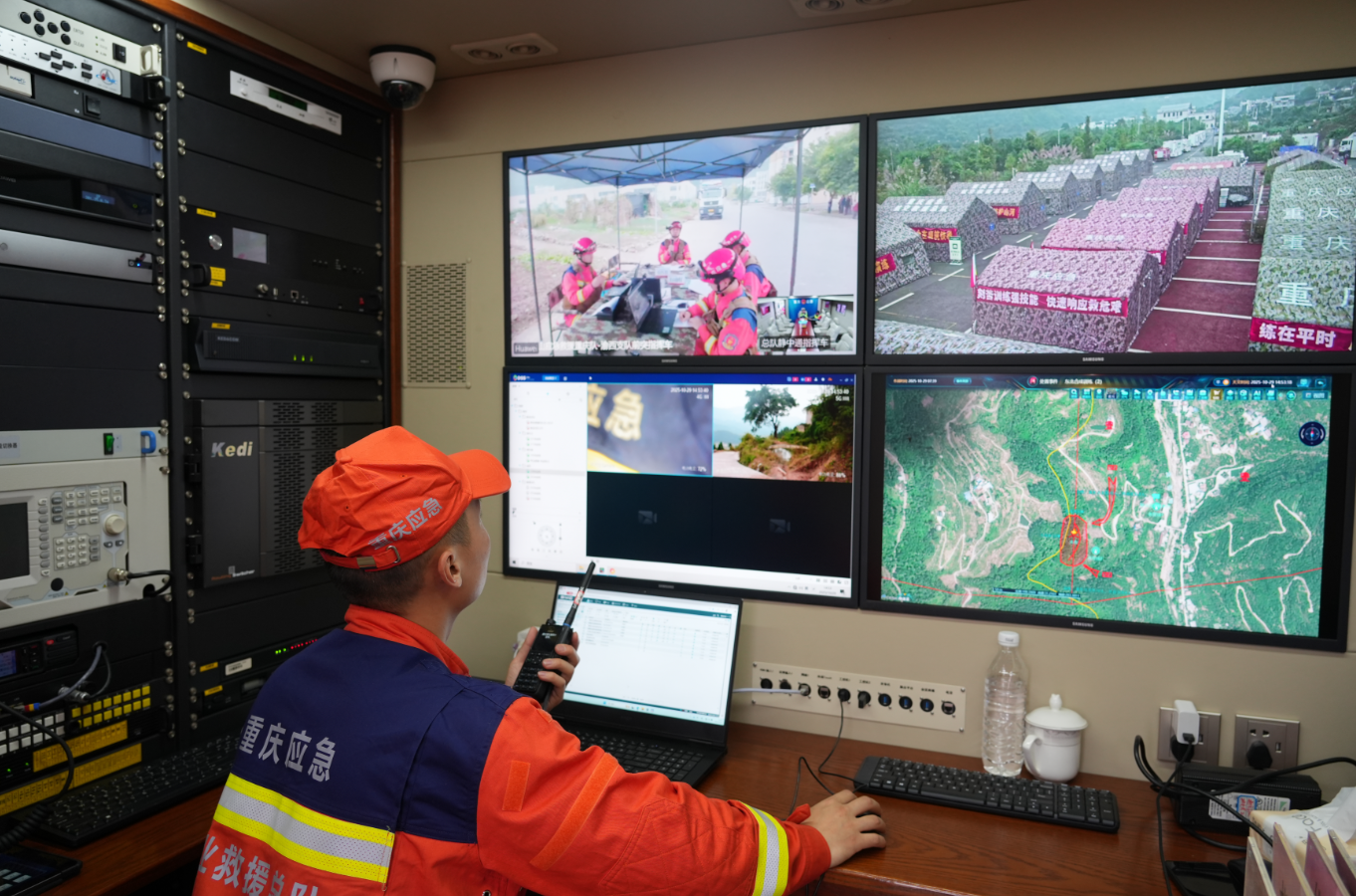 市、区级救援力量摩托化开进至预定地域后,不经调整立即按战斗队形展开携装5公里强行军,检验片区应急救援队伍跨区域快速投送能力。为模拟“断路、断电、断网”等极端灾害救援环境,导调组待队伍进场后立即关闭公网指挥链路,阻断常规指挥通道,队伍顿时首尾不能相顾。重庆市专业救援总队通信支队依靠卫星网、370MHz基站和无人机等设备搭建通信网络快速保通,展开“静中通”通信指挥车搭建前进指挥所,与市局指挥中心实现互联互通。