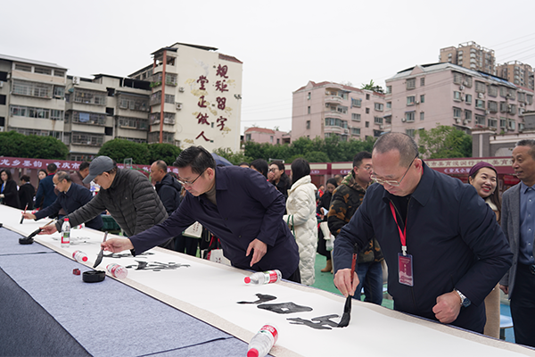 开幕式后,嘉宾们步入30米长卷书写区,共同执笔素绢长卷,以笔墨为语、以翰墨传情,在挥毫间续写“龙跳天门,虎卧凤阙”的书法雅韵,共同谱写“龙乡墨韵”的华彩篇章。与此同时,铜梁区共400余名学生代表同场挥毫,进行硬笔、软笔书法展示。