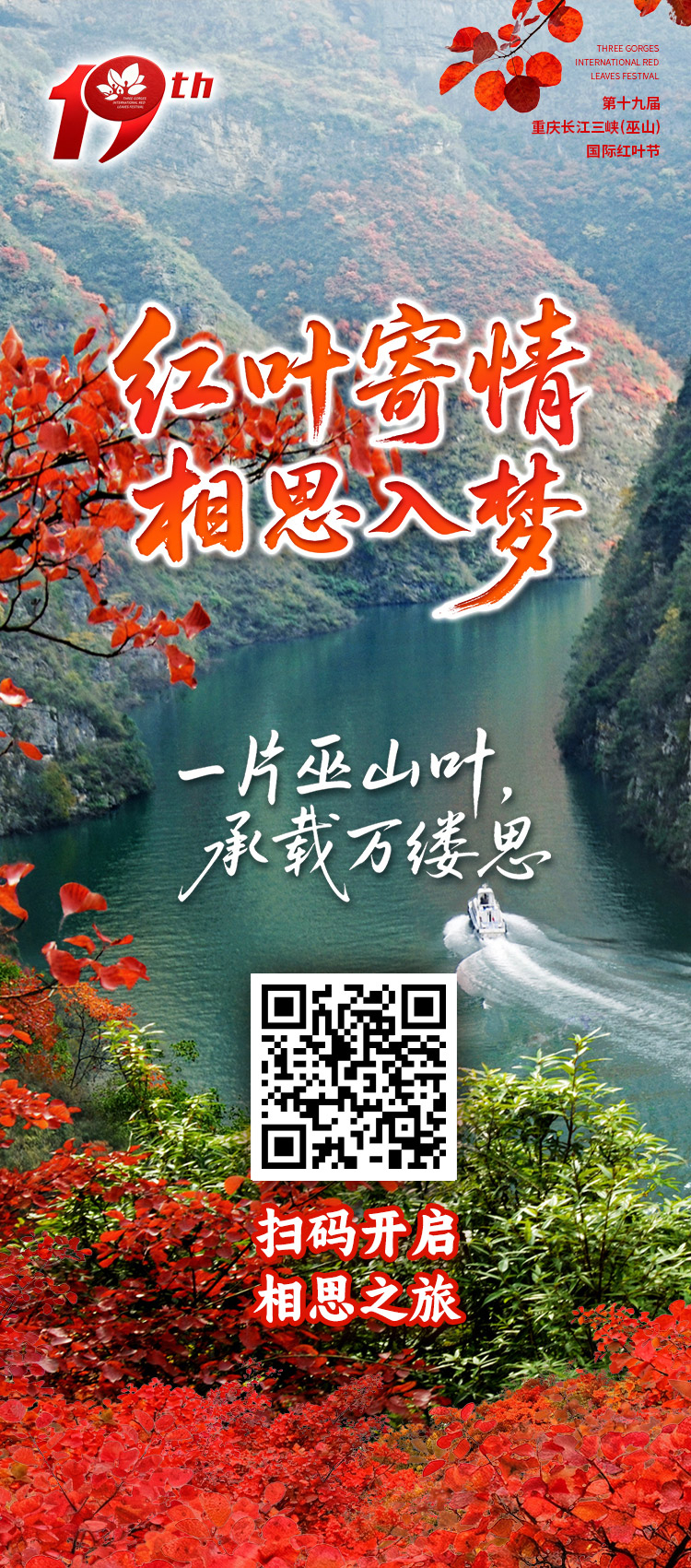 随着第十九届重庆长江三峡(巫山)国际红叶节盛大启幕,漫山遍野的赤红霞帔再次成为长江三峡最动人的风景线。本届红叶节为游客奉上了一场视觉盛宴,无法亲临的人也可以通过互动H5,开启了一场跨越千里的数字化情感传递之旅。你的思念,准备托付给哪一片巫山红叶?扫描海报二维码,立即解锁唯美H5,即可:沉浸欣赏红叶诗意画卷,定制你的专属相思海报,一键将这份来自巫山红叶节的独特浪漫与思念之情分享给心中的那个“TA”。