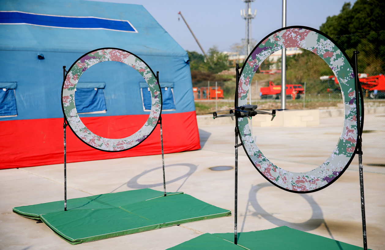 应急救援员操纵无人机精准穿越窄窄的圆环。