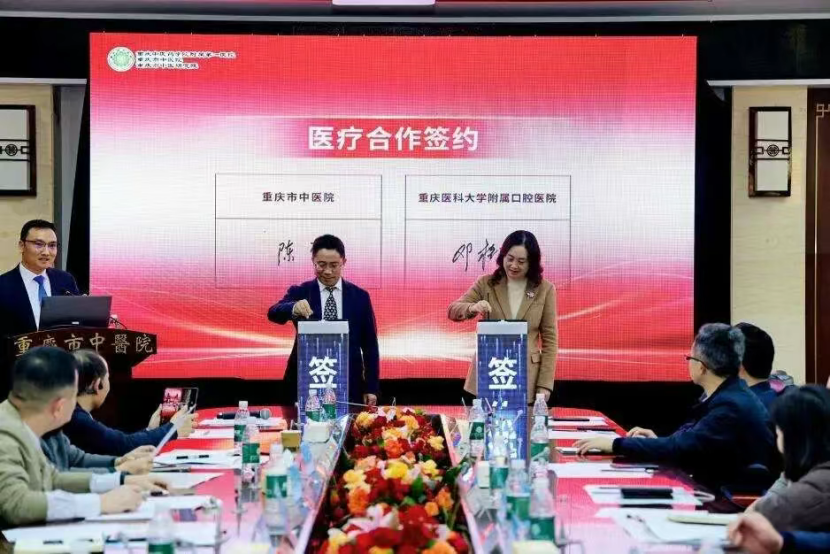会议期间举行了“中西协同 专科联动”医疗合作签约仪式。重庆市中医院纪委书记陈平与重庆医科大学附属口腔医院纪委书记邓桂芳代表双方医院签署合作协议。双方将充分发挥中医药特色与西医专科优势,为患者提供更加优质、整合的医疗服务。