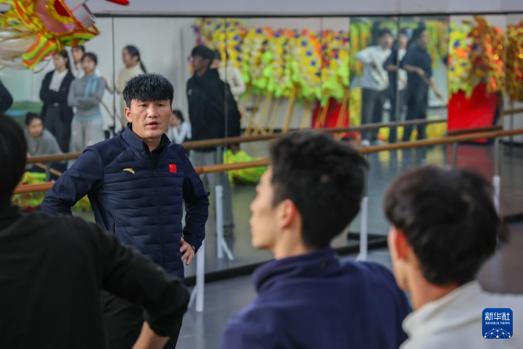 12月7日,重庆铜梁龙艺术团团长蔡明灿(左二)在指导竞技舞龙队队员进行动作训练。新华社记者 黄伟 摄