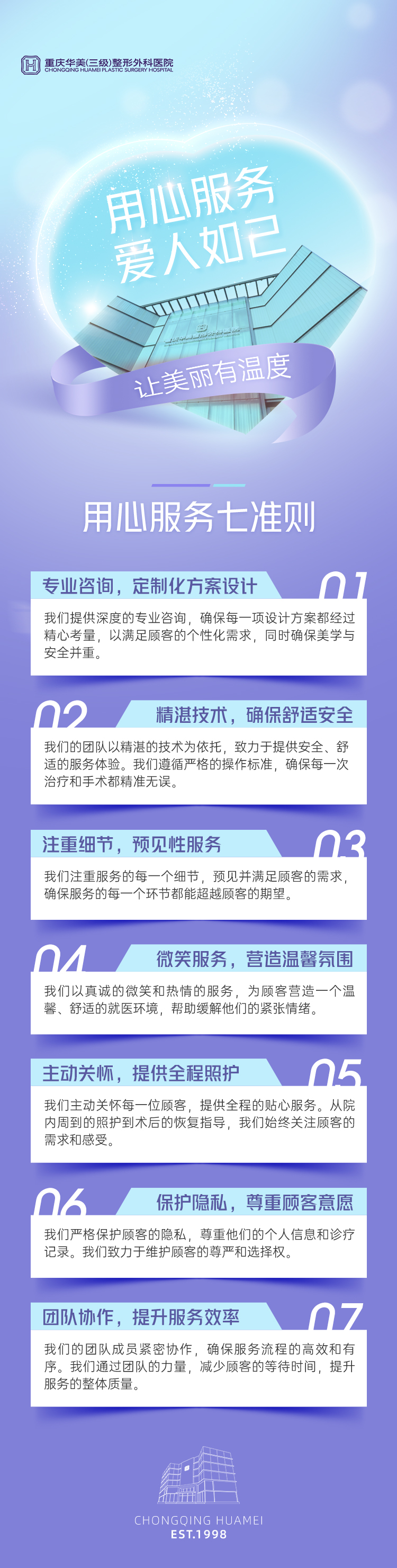 “1000句标准化的‘你好’,不如1句记住顾客喜好的问候。”这是咖啡师王涛的服务信条,更是重庆华美个性化服务的生动诠释,而这份对细节的极致追求,正是重庆华美服务口碑持续领跑重庆医美的核心密码。作为一家专业的医美机构,我们要保证,求美者在参与到医疗行为的过程中,能够得到全方位的服务保障。2021年11月,重庆华美率先在行业内发布《服务承诺白皮书》,围绕合规医疗、合规宣传、用心服务三大板块制定标准,2024年10月深入细化,颁布了“用心服务七准则”,旨在为顾客提供美与安全兼具的高品质服务,既传递服务温度,也提升服务效率。