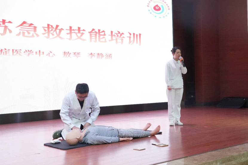 活动现场还设置了实用的公益科普环节。重庆市血液中心献血招募科主管护师谢伶俐围绕献血常识、用血政策及志愿者权益等内容进行了细致讲解,帮助公众更全面地理解献血的意义与保障。随后,重医大附三院急诊与重症医学中心护士长敖琴与主治医师李静涵现场配合,完整演示了心肺复苏术的关键步骤与操作要领。