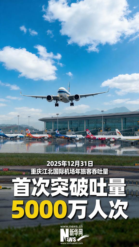 新华网重庆12月31日电(陶玉莲)2025年12月31日,乘坐华夏航空从重庆飞往库尔勒的旅客蒲东升,成为重庆江北国际机场年度旅客吞吐量超5000万人次中的一员。“很感谢机场提供的便利服务,希望重庆机场越飞越远、越飞越高,支线网络也越来越广。”