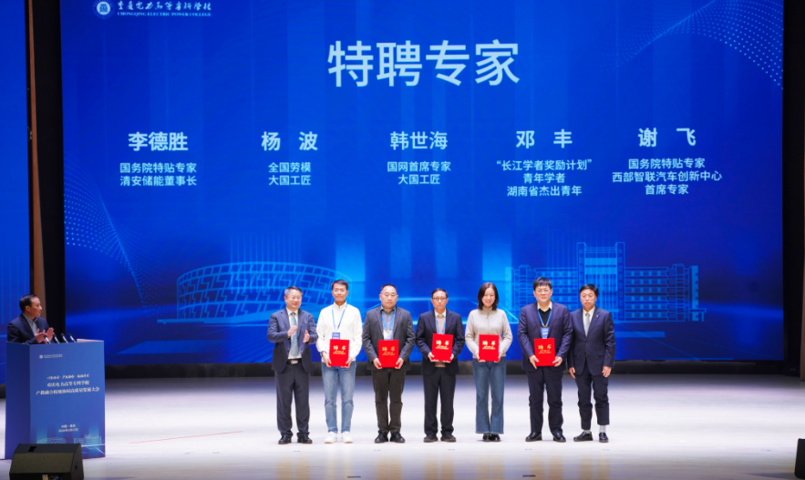 会上,重庆电力高等专科学校向国网首席专家韩世海,重庆工业设备安装集团全国劳模杨波,“长江学者奖励计划”青年学者邓丰,清安储能董事长李德胜,西部科学城智能网联汽车创新中心首席专家谢飞颁发外聘专家聘书。