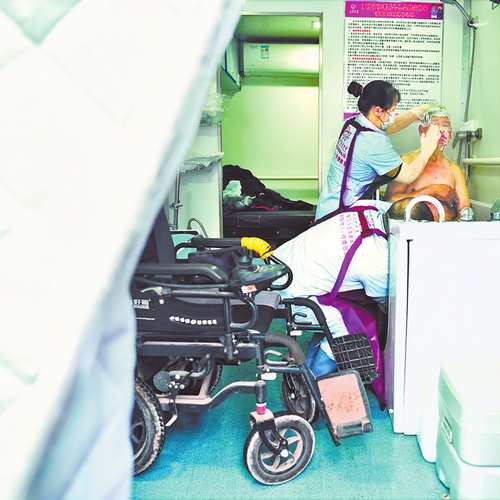 图③:志愿者在“助浴快车”上为一位腿部残疾的老人洗澡。