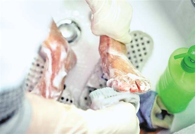 图②:志愿者用刷子为老人搓脚。