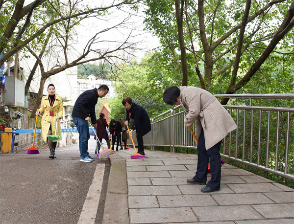 3月28日,綦江区古南街道百步梯社区,一群热心的志愿者正低头弯腰忙着手中的活,他们或是机关单位干部,或是企业老总,但此刻他们有一个共同的身份,那就是綦江区政协委员,正忙着发宣传资料、清扫地面、清理花台、擦拭玻璃……