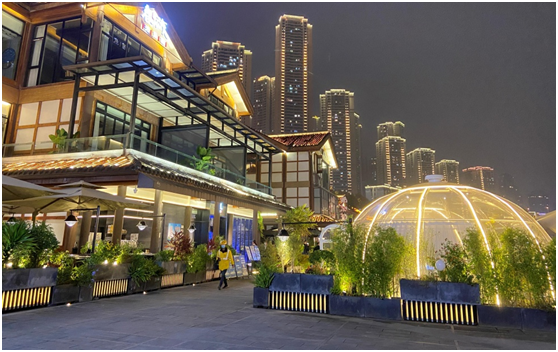 其中,外街除了都市休闲旅游,商业辅以餐饮、娱乐、演艺、阅读等业态,同时引入符合项目调性的首店品牌及“引爆点”的IP,实现项目整体品质调性与文化的融合协调,吸引了成渝双城消费节、“爱尚重庆”消费节等多场主题活动落地。