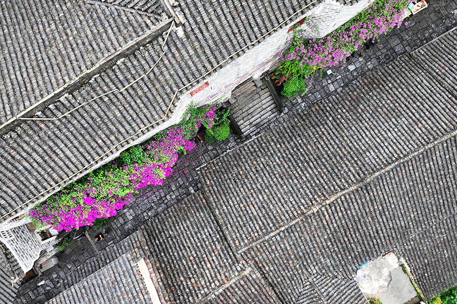 瓦房屋顶间,三角梅成为美好的点缀。摄影:陈碧生