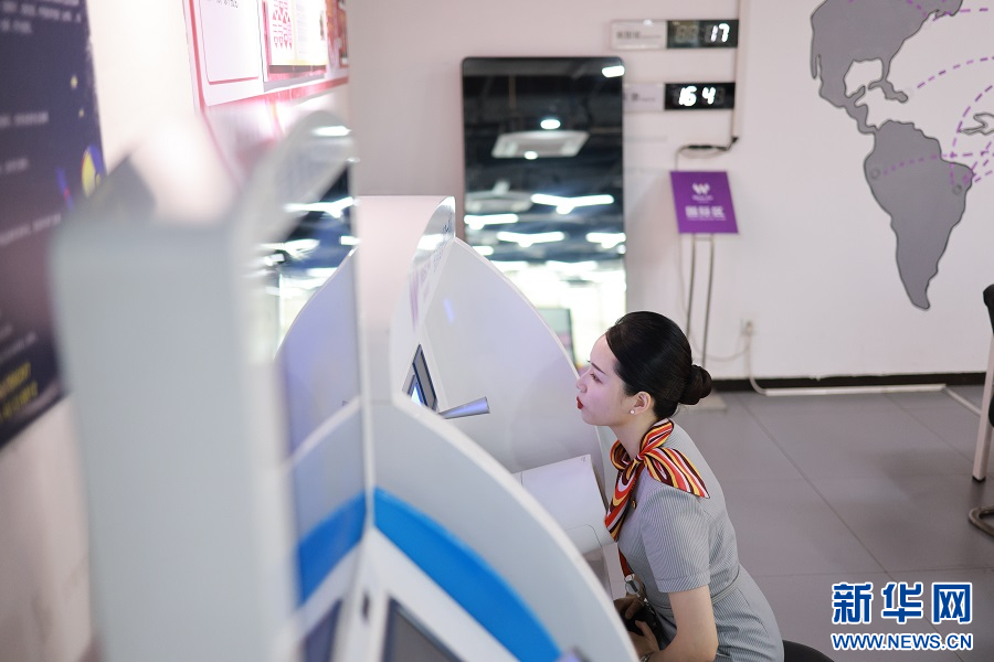 梁曦迎接乘客乘机。新华网发(苏志刚 摄)