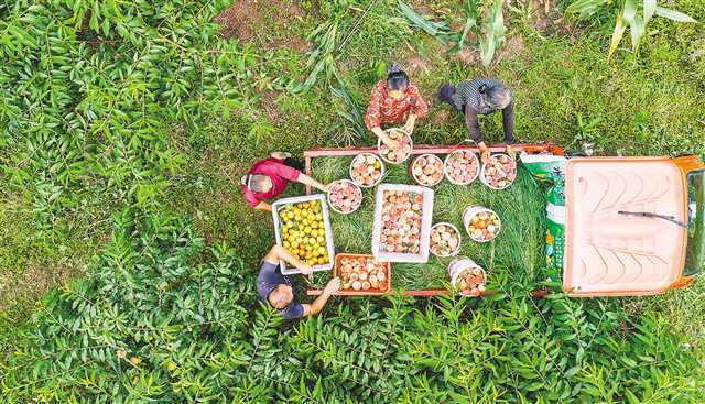 7月3日,垫江县砚台镇新渡村,香桃、脆桃、李子等水果喜获丰收,果农正在抓紧采摘。