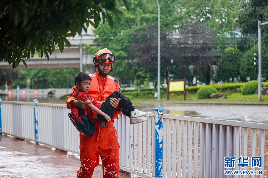 7月20日8时至21日8时,重庆多地出现中到大雨,潼南、铜梁、荣昌等27个区县出现暴雨。为应对本轮强降雨,重庆市防汛抗旱指挥部针对渝北区、渝中区、江北区、南岸区、九龙坡区等20个区县启动防汛Ⅳ级应急响应。重庆多地公安、消防等相关部门紧急出动,守护百姓安全。图为大渡口区消防救援支队消防员疏散被困市民时抱着一名小朋友过积水路段。新华网 发