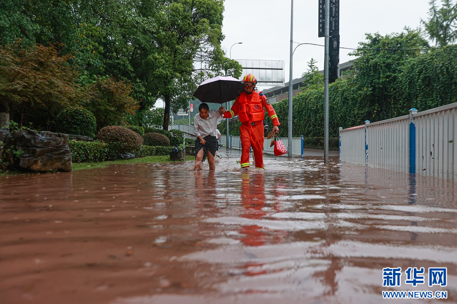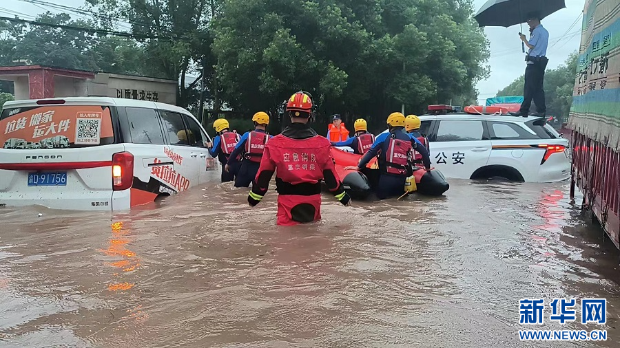 铜梁区消防救援支队消防员正在转移被困市民。新华网 发