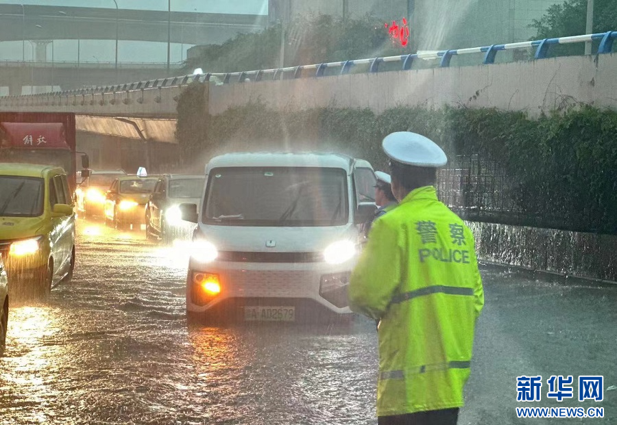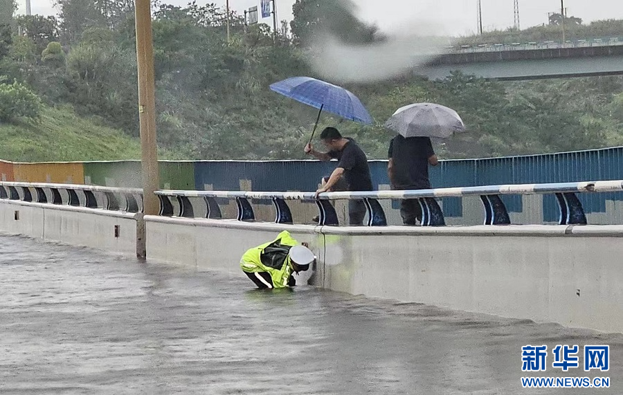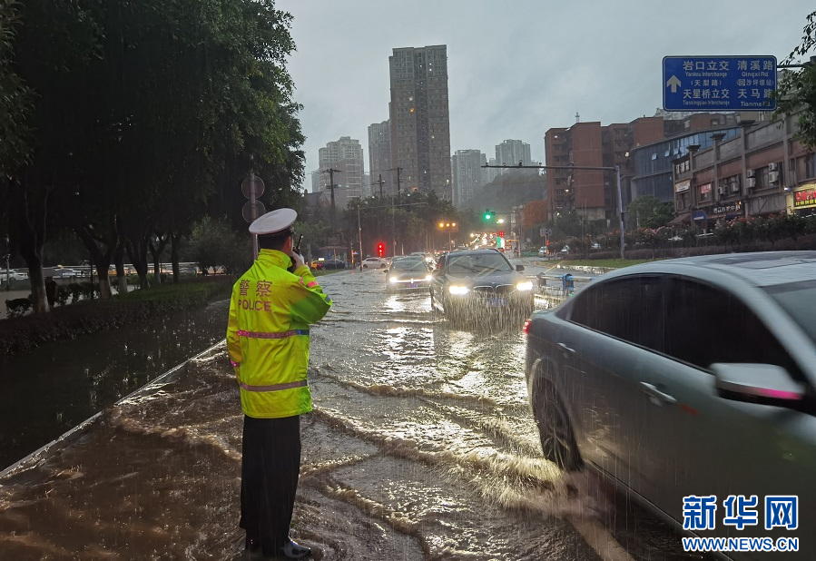 渝中区公安分局民警在暴雨中指挥车辆安全行驶。新华网 发