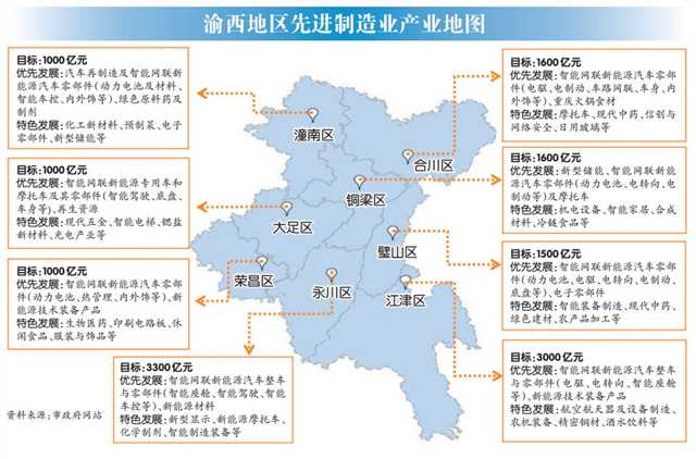 《计划》还提出,渝西地区每个区应确立不超过2个主导产业,同时确立若干特色产业进行布局。比如,江津可优先发展智能网联新能源汽车整车与零部件、新能源技术装备产品,特色发展航空航天器及设备制造、农机装备等;合川可优先发展智能网联新能源汽车零部件、火锅食材,特色发展摩托车、现代中药、信创与网络安全等。