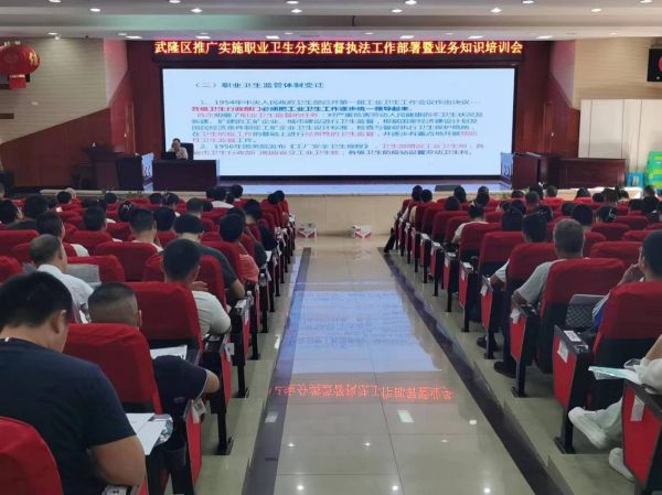 武隆区卫生健康执法支队详细解读了推广实施职业卫生分类监督执法工作方案,并对职业病危害综合风险评估操作系统进行培训。区卫生健康委党委委员、执法支队支队长余洪在会上对职业卫生分类监督执法工作做出部署,明确提出各用人单位要全面落实主体责任,认真落实会议精神,真实准确地填写用人单位职业病综合风险评估报告。