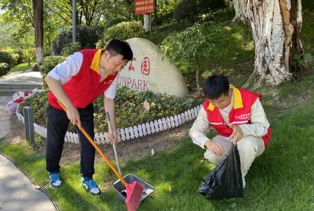 志愿者正在渝北区百林公园进行垃圾清理,开展全国生态日的志愿活动。(钟雪 摄)