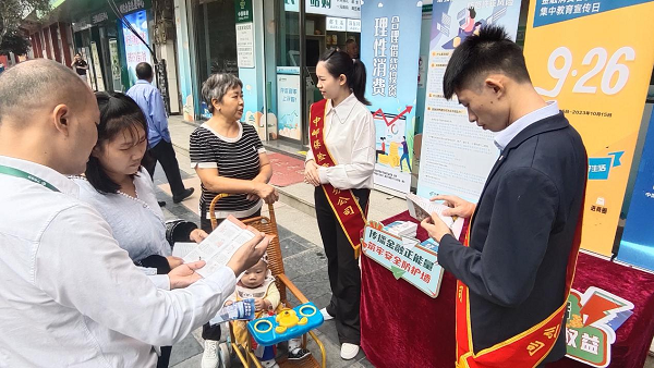 宣讲员为来往市民讲解金融知识,发放金融知识宣传折页。