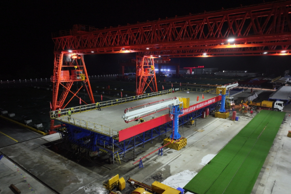 据中铁五局安岳梁场负责人周涛介绍,本次浇筑的首片箱梁长40.6米,宽12.6米,高3米,重约1000吨。项目利用物联网、“互联网+”和数字孪生等多种技术手段,实现物资管理、生产管理、进度管理、质量管理、安全管理的少人化、可视化、智能化、信息化,确保箱梁施工过程管控和产品质量全面过硬。