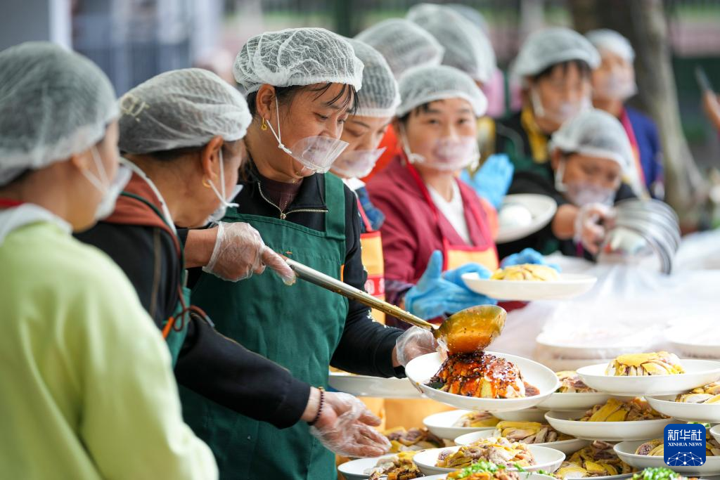 10月19日,重庆市九龙坡区华岩镇石龙社区志愿者在为参加“长寿宴”的老人们上菜。新华社记者 刘潺 摄